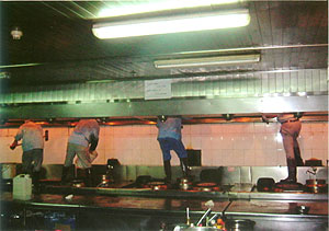 我們將重點對平行煙道內(nèi)部進行徹底清洗。采用的主要方法是人員進入煙道內(nèi)部進行清洗;對于外部豎形油煙管道采用人工拆卸加高壓清洗機進行清洗。